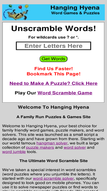 These are famous or funny quotes encryped with a scrambled alphabet code - if you can guess the code you can decipher the message. Com More About Hanging Hyena This word scramble maker is designed to load very quickly and look great on mobile phones. The jumble solver uses the same free dictionary that many of the online word games use ENABLE which covers most of the English language.